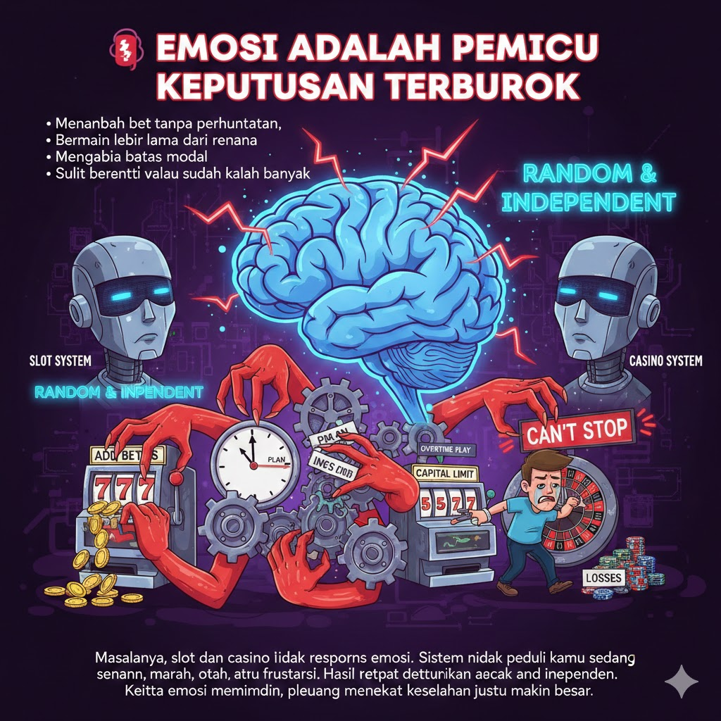 Dalam permainan slot dan casino online, tantangan terbesar sering kali bukan pada sistem permainan, melainkan pada emosi pemain sendiri. Rasa senang saat menang, kecewa saat kalah, dan dorongan untuk “balik modal” bisa membuat keputusan berubah tanpa disadari.