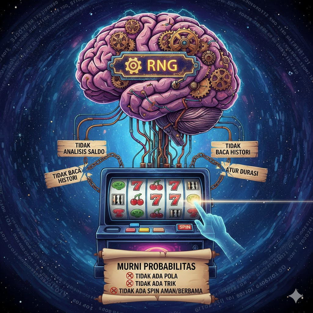 RNG (Random Number Generator) adalah sistem yang menghasilkan angka acak secara terus-menerus, bahkan saat tidak ada pemain yang menekan tombol spin.