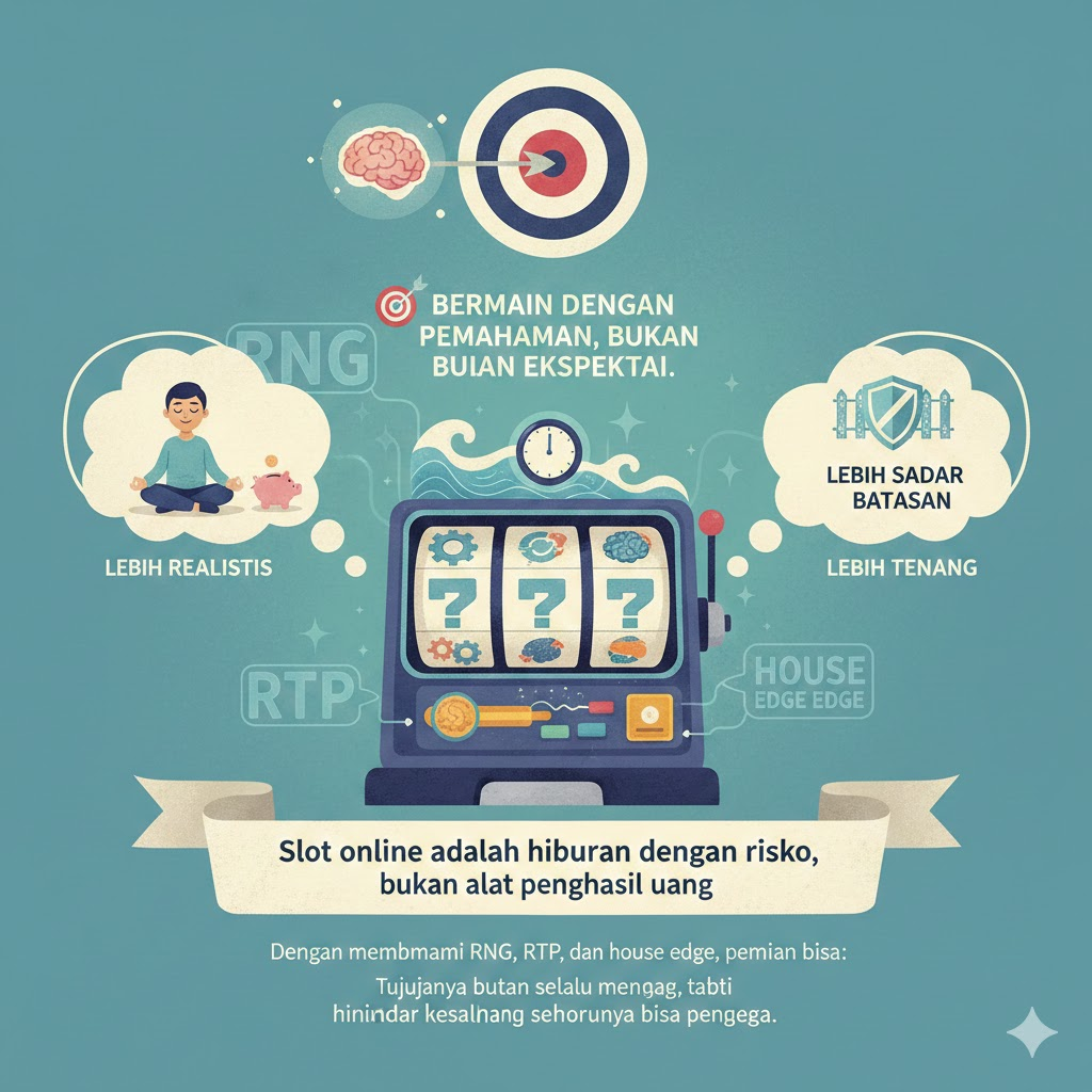 Slot online adalah hiburan dengan risiko, bukan alat penghasil uang. Dengan memahami RNG, RTP, dan house edge, pemain bisa: